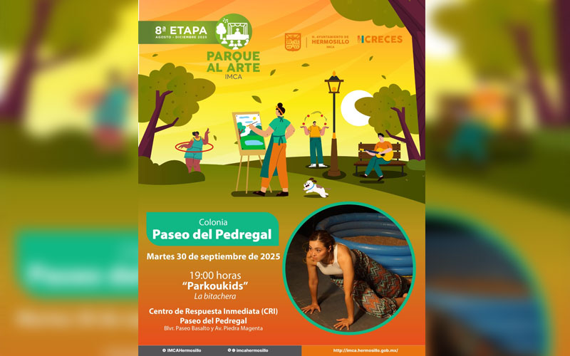 Hermosillo, Sonora; 29 de septiembre de 2025.- El Instituto Municipal de Cultura y Arte (IMCA) invita a las familias de la colonia Paseo del Pedregal a participar en el taller “Parkoukids” de La Bitachera Teatro, que se realizará este martes 30 de septiembre a las 7:00 de la tarde, en el marco de la octava etapa del programa Parque Al Arte.