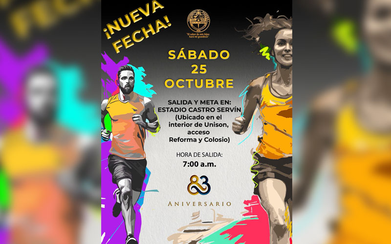 Hermosillo, Sonora, 20 de octubre de 2025.- La Carrera del 83 Aniversario de la Universidad de Sonora se llevará a cabo el sábado 25 de octubre. El evento deportivo fue reprogramado luego de que las condiciones climatológicas impidieran su realización el pasado 12 de octubre.