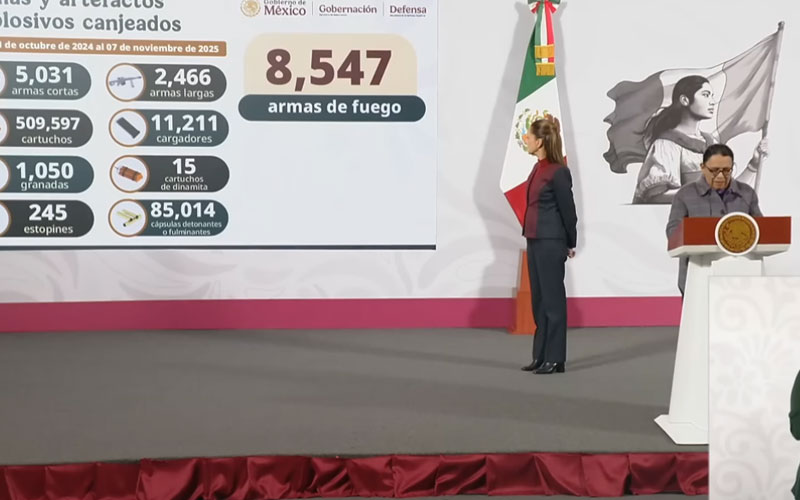 Mencionó que en el programa Sí al Desarme, Sí a la Paz, vigente desde octubre de 2024, se han canjeado 8 mil 547 armas de fuego, incluidas 2 mil 466 armas largas, 5 mil 31 cortas y mil 50 granadas, además de 6 mil 300 juguetes bélicos sustituidos por juguetes educativos.