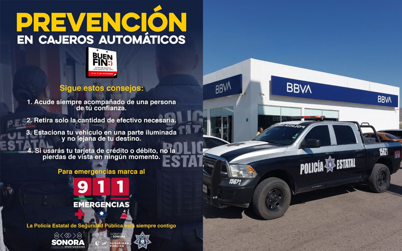 La SSP como parte de su labor preventiva, exhortó a las y los sonorenses a mantenerse alerta al momento de realizar una disposición de dinero y ante cualquier signo de alerta reportar a la línea 9-1-1.