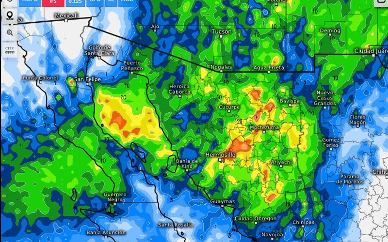 También se anticipa la probabilidad de chubascos y lluvias fuertes en el noroeste, norte, noreste, centro y oriente de Sonora. Se mantiene la probabilidad de caída de nieve y/o aguanieve sobre las zonas montañosas debido a este fenómeno.