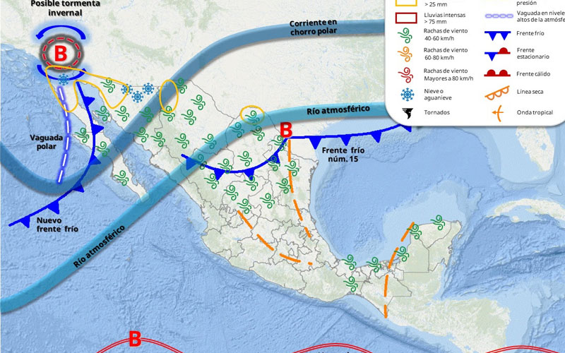 Este sistema, en interacción con una vaguada polar, una circulación ciclónica en niveles medios y altos de la atmósfera, la corriente en chorro polar y un río atmosférico, dará origen a la primera tormenta invernal. Esta situación ocasionará lluvias con chubascos durante el viernes en los municipios de San Luis Río Colorado, Gral. Plutarco Elías Calles y Puerto Peñasco.