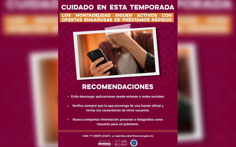Hermosillo, Sonora, 24 de noviembre de 2025.- Ante la proximidad de fin de año, periodo en el que aumenta la búsqueda de financiamientos y préstamos rápidos, la Unidad Cibernética de la Secretaría de Seguridad Pública (SSP) alerta a la ciudadanía sobre la operación continua de aplicaciones y plataformas fraudulentas conocidas como “Montadeudas”.