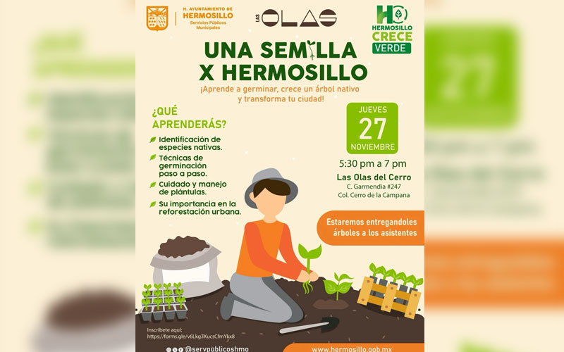 Hermosillo, Sonora, 25 de noviembre, 2025.- Una invitación a las y los hermosillenses a asistir al taller gratuito “Una Semilla X Hermosillo” donde aprenderán a germinar y crecer un árbol nativo para contribuir a transformar la ciudad realizó Amparo Fontanot Ochoa, directora de Parques y Jardines de Servicios Públicos Municipales.