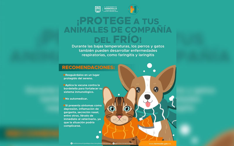 Hermosillo, Sonora, 31 de diciembre, 2025.- Un llamado a proteger a los animales de compañía durante la temporada invernal realizó el Instituto Municipal de Protección y Bienestar Animal, ya que pueden desarrollar enfermedades respiratorias.