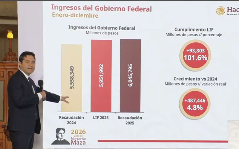 Para 2026, la previsión de la Ley Federal de Ingresos es de 6 billones 448 mil millones de pesos, un incremento nominal de 496, a unos 28 mil millones de dólares, con un aumento en términos reales de 4.6 por ciento”, apuntó.