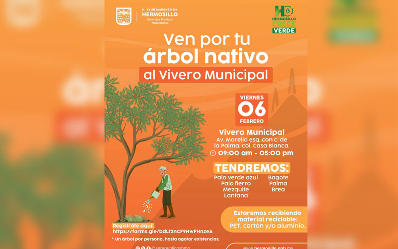 Hermosillo, Sonora, 4 de febrero de 2026.- Para fomentar la reforestación urbana y el cuidado del medio ambiente, el Ayuntamiento de Hermosillo, a través de Servicios Públicos Municipales y el programa Hermosillo Crece Verde, invita a la ciudadanía a participar en la entrega gratuita de árboles nativos en el Vivero Municipal.