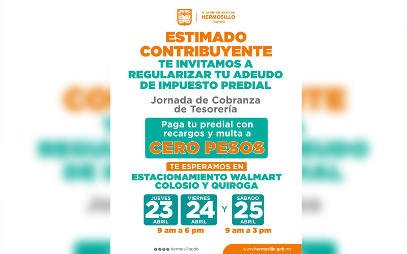 Hermosillo, Sonora; 21 de abril de 2026.- El estacionamiento de la tienda Walmart de Colosio y Quiroga será sede del jueves 23 al sábado 25 de abril de una jornada en la que ciudadanas y ciudadanos con adeudos pendientes por concepto de predial podrán ponerse al corriente con recargos y multas a cero pesos.