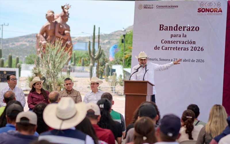 Ímuris, Sonora; 23 de abril de 2026.- La red carretera federal libre de peaje se transforma en Sonora con el impulso del gobernador Alfonso Durazo Montaño y el respaldo de la presidenta Claudia Sheinbaum Pardo, al dar inicio en Ímuris a los trabajos de conservación y mantenimiento de esta rúa, con el objetivo de mejorar la seguridad vial, la conectividad, y el desarrollo económico de la entidad.