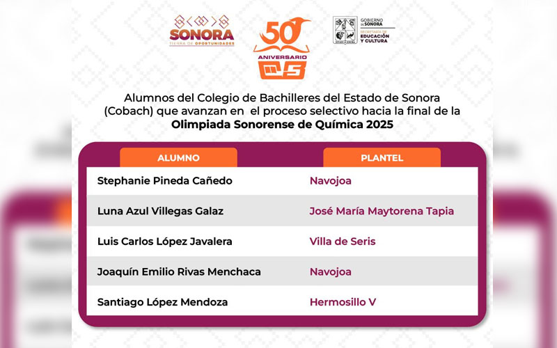 Stephanie Pineda Cañedo y Joaquín Emilio Rivas Menchaca (plantel Navojoa), Luna Azul Villegas Galaz (plantel José María Maytorena Tapia de Guaymas), Luis Carlos López Javalera (plantel Villa de Seris) y Santiago López Mendoza (plantel Hermosillo 5) avanzaron en el proceso selectivo para integrar la delegación sonorense que asistirá a la Olimpiada Nacional de Química 2025.
