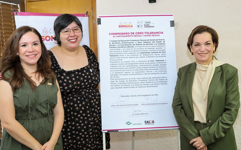 Hermosillo, Sonora, 3 de octubre de 2025.- Como parte de las acciones impulsadas por el gobernador Alfonso Durazo, orientadas a crear entornos seguros y libres de violencia, el Colegio de Educación Profesional Técnica del Estado de Sonora (Conalep) realizó la firma del Compromiso de Cero Tolerancia al Hostigamiento y Acoso Sexual.
