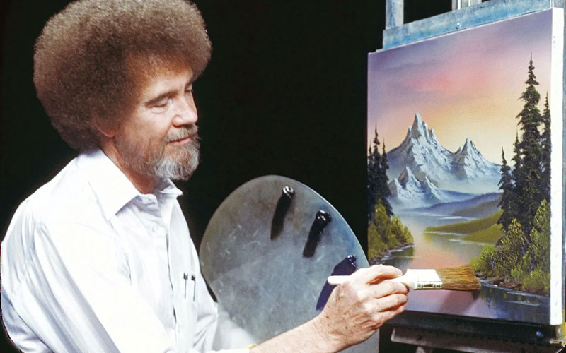 Mientras trabajaba al aire, Ross solía hablar sobre pintar pequeñas nubes y árboles felices, y calificaba a los errores como “accidentes felices”.