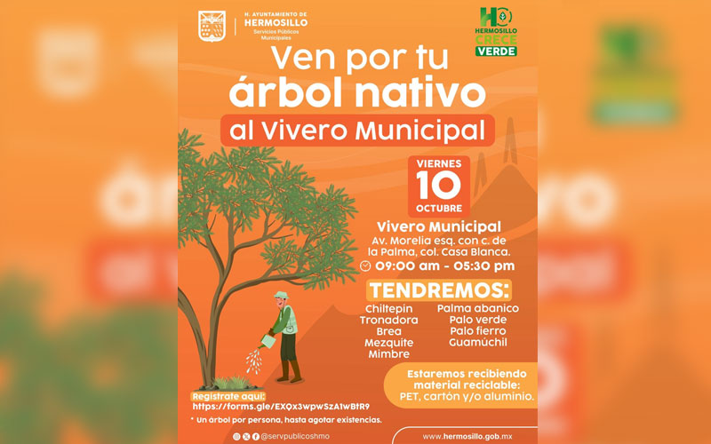 Hermosillo, Sonora, 7 octubre de 2025.- El Ayuntamiento de Hermosillo, a través de Servicios Públicos Municipales, invita a la ciudadanía a participar en la jornada de entrega de árboles nativos que se llevará a cabo este viernes 10 de octubre.