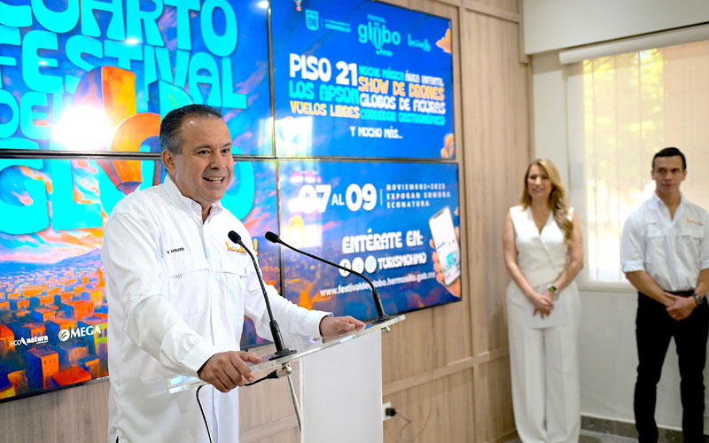 Hermosillo, Sonora; 24 de octubre, 2025.- Hermosillo está listo para llenarse de color, música y diversión con la cuarta edición del Festival del Globo, anunció el presidente municipal Antonio Astiazarán, quien invitó a las familias a disfrutar de este espectáculo único que combina paisajes inolvidables con 20 globos aerostáticos, concierto gratuito de Piso 21 y muchas actividades.