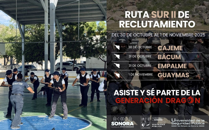 La segunda ruta de reclutamiento de la USP se realizará del 30 de octubre al primero de noviembre del presente año y, tiene la finalidad de fortalecer los estados de fuerza en los municipios de Cajeme, Bácum, Empalme y Guaymas, así como en el resto de las corporaciones de seguridad pública.