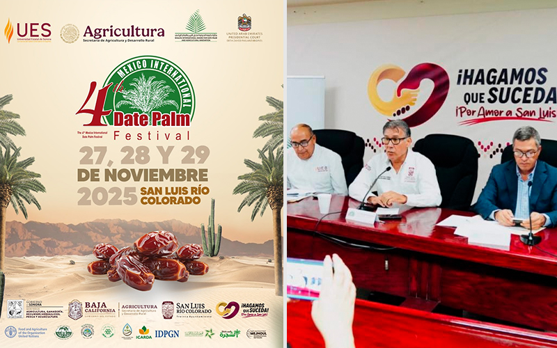 San Luis Río Colorado, Sonora; 31 de octubre de 2025.- Con el impulso del Gobierno de Sonora, a través de la Universidad Estatal de Sonora (UES), se anunció la realización del 4to. Festival Internacional de la Palma Datilera en México, que se llevará a cabo los días 27, 28 y 29 de noviembre en San Luis Río Colorado.