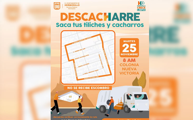 Hermosillo, Sonora, 24 de noviembre, 2025.- Este martes 25 de noviembre, personal de Servicios Públicos Municipales y de la Dirección de Salud Municipal acercará a la colonia Nueva Victoria una jornada de descacharre intensiva.