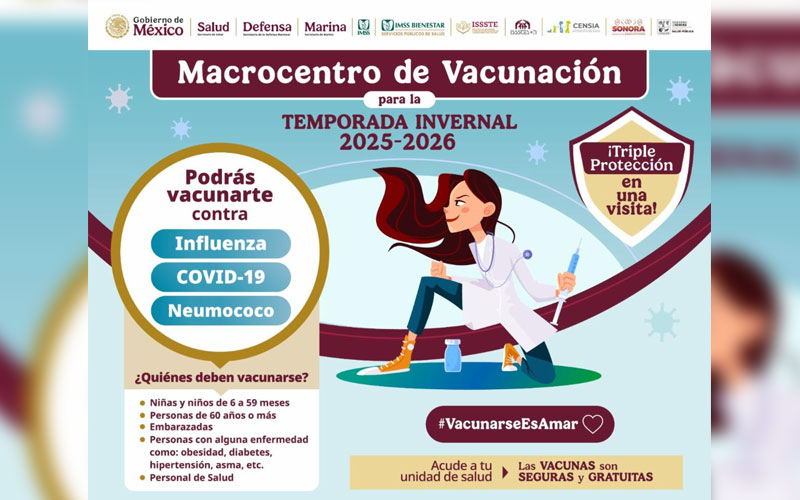 Hermosillo, Sonora, 25 de noviembre de 2025.- La Secretaría de Salud invita a la Ceremonia de Arranque del Macrocentro de Vacunación para la Temporada Invernal 2025–2026, que se realizará el 27 de noviembre de 2025 a las 11:00 horas en el Gimnasio Ana Gabriela Guevara.