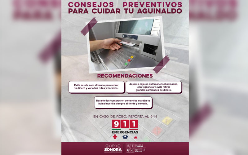 Hermosillo, Sonora, 2 de diciembre de 2025.- Con la llegada de la temporada decembrina y el pago de aguinaldos, la Secretaría de Seguridad Pública (SSP) exhorta a la ciudadanía a tomar medidas preventivas para proteger su patrimonio y evitar ser víctimas de delitos.