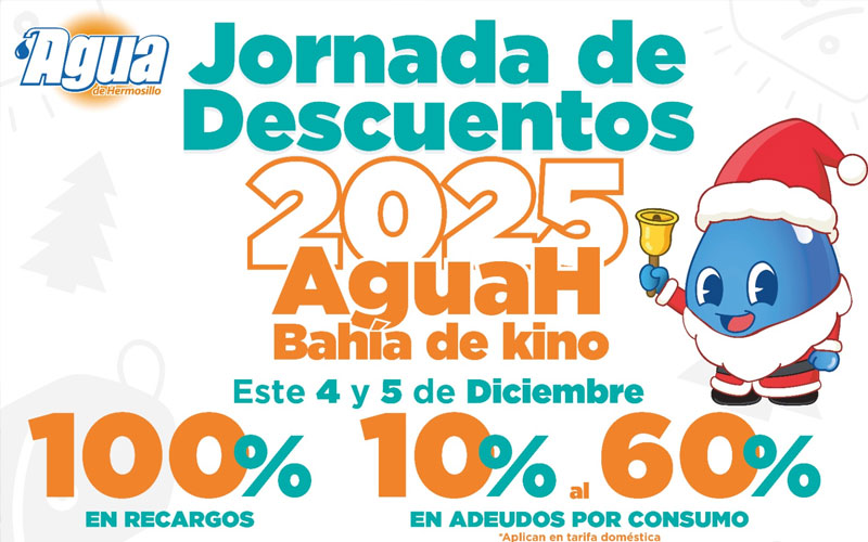 Hermosillo, Sonora, 4 de diciembre del 2025.- Con el objetivo de apoyar la economía familiar y facilitar la regularización de cuentas de consumo de agua, Agua de Hermosillo realiza Jornada de Descuentos 2025 los días 4 y 5 de diciembre en los módulos de Bahía de Kino, Miguel Alemán, San Pedro y La Victoria.