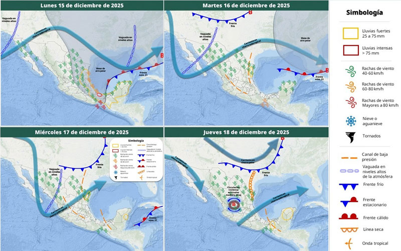 Las temperaturas mínimas en la región norte se ubicarán entre los tres y ocho grados, en el oriente entre 2 y 12 grados, en el sur entre 10 y 15 grados, en la región centro entre 11 y 16 grados, mientras que en el noroeste del estado oscilarán entre 12 y 17 grados a lo largo de la semana.
