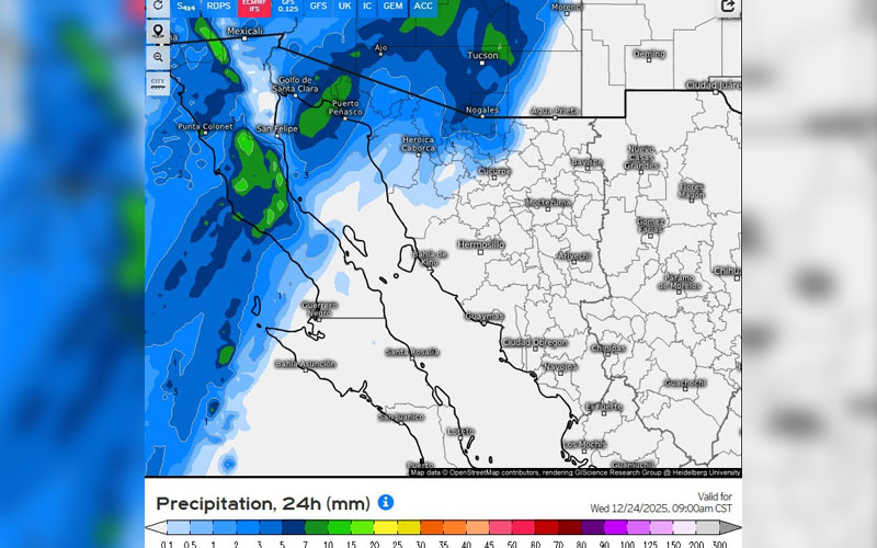 Asimismo, existe la probabilidad de precipitaciones ligeras a moderadas en municipios del noroeste de Sonora durante la noche de este martes y el día 24 de diciembre.