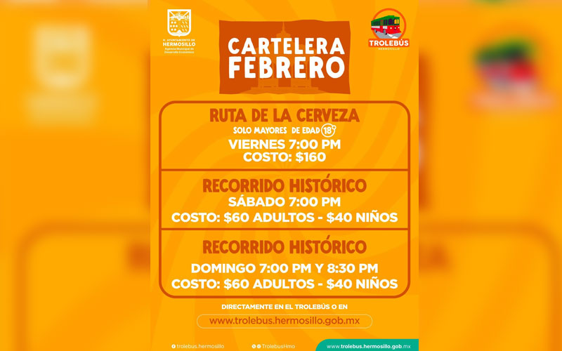 Hermosillo, Sonora; 4 de febrero de 2026.- La Dirección de Desarrollo Turístico de la Agencia Municipal de Desarrollo Económico del Ayuntamiento de Hermosillo, invita a la ciudadanía a disfrutar de la Cartelera de Febrero del Trolebús, que ofrece recorridos turísticos y experiencias culturales para residentes y visitantes.