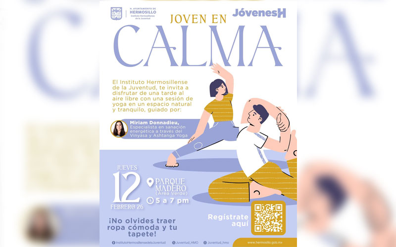 Hermosillo, Sonora; 9 de febrero de 2026.- El Gobierno Municipal de Hermosillo, a través del Instituto Hermosillense de la Juventud (IHJ), llevará al área verde del Parque Madero la sesión de yoga al aire libre “Joven en Calma”, el próximo jueves 12 de febrero, Informó Francisco Villaescusa.