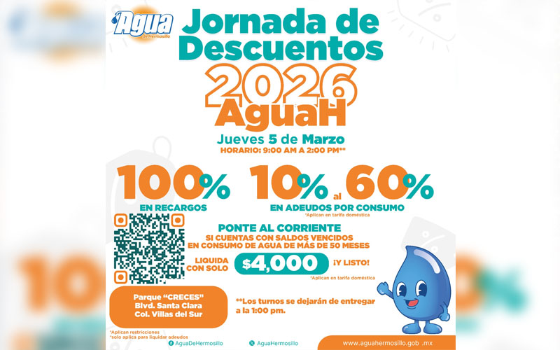 Hermosillo, Sonora; 3 de marzo, 2026.- Este jueves 5 de marzo de 9:00 a 14:00 horas se llevará a cabo la Jornada de Descuentos que impulsa Agua de Hermosillo en las instalaciones del Parque “CRECES”, ubicado en bulevar Santa Clara, en la colonia Villas del Mar, para la ciudadanía que desee ponerse al corriente en sus pagos.