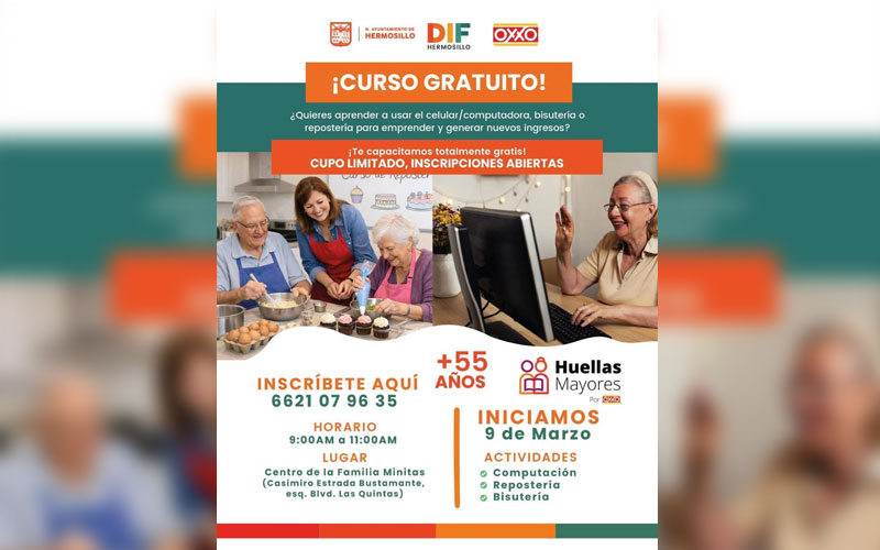 Hermosillo, Sonora; 3 de marzo de 2026.- Personas mayores de 55 años interesadas en adquirir nuevas habilidades ya pueden inscribirse a los cursos gratuitos de computación, bisutería y repostería que DIF Hermosillo y “Huellas Mayores” de tiendas OXXO organizan a partir del 9 de marzo de 2026.
