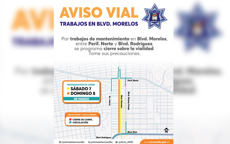 Hermosillo, Sonora, 6 de marzo de 2026.- Como parte de las acciones de mantenimiento de vialidades y calles en la ciudad, este sábado 7 y domingo 8 de marzo se intervendrá el tramo de bulevar Morelos entre Periférico Norte y bulevar Rodríguez, anunció Astarté Corro Ruiz.