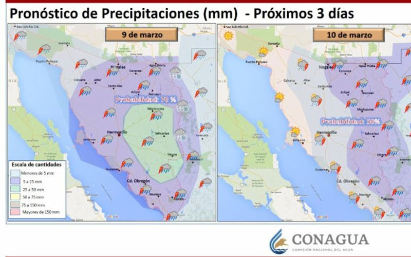Se esperan además fuertes rachas de viento sobre el norte y oriente del estado de Sonora.