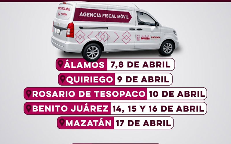 Hermosillo, Sonora, 6 de abril de 2026.- El Gobierno de Sonora, a través de la Dirección General de Recaudación de la Secretaría de Hacienda, informa a los contribuyentes que la agencia fiscal móvil estará presente en los municipios del sur del estado con el fin de acercar los servicios a los contribuyentes.