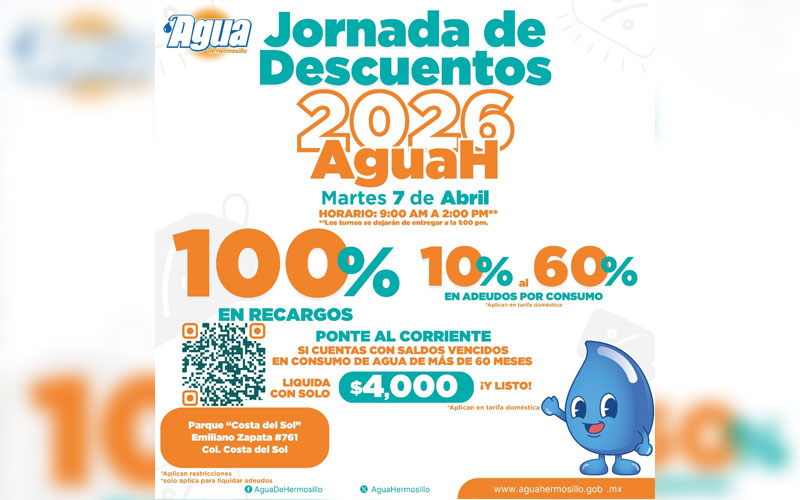 Hermosillo, Sonora; 6 de abril de 2026.- Este martes 7 de abril de 9:00 a 14:00 horas se llevará a cabo la Jornada de Descuentos que impulsa Agua de Hermosillo en las instalaciones del parque ubicado en calle Emiliano Zapata número 761 en la colonia Costa del Sol, para las y los usuarios que deseen ponerse al corriente en sus pagos.
