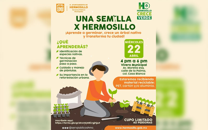 Hermosillo, Sonora, 20 de abril de2026.- Una invitación a las y los hermosillenses a asistir al taller gratuito “Una Semilla X Hermosillo” donde aprenderán a germinar y crecer un árbol nativo para contribuir a transformar la ciudad realizó Amparo Fontanot Ochoa, directora de Parques y Jardines de Servicios Públicos Municipales.