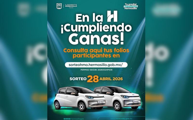 Recordó a las y los contribuyentes que pagaron a tiempo el predial 2026 de enero a marzo que pueden consultar los folios con los que participarán ingresando al sitio web oficial del Gobierno de Hermosillo: www.hermosillo.gob.mx y dar click en el banner de consulta.