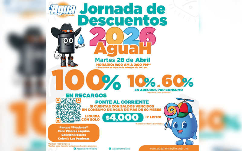 Personal del organismo operador, en un horario de 9:00 de la mañana a 2:00 de la tarde, ofrecerá beneficios como el 100 por ciento de descuento en recargos, además de descuentos del 10 al 60 por ciento en adeudos por consumo en tarifa doméstica, con el objetivo de apoyar la economía de las familias hermosillenses.